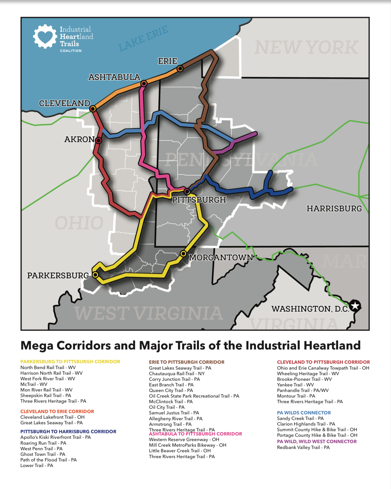 Industrial Heartland Trail Coalition system – The Parkersburg to Pittsburgh (P2P) Corridor is one of eight corridors that comprise the Industrial Heartland Trail Coalition system. This system, when complete, will consist of more than 1,500 miles of trail through 51 counties in four states. It will be one of the largest trail systems in the world. It is currently approximately 52% complete.